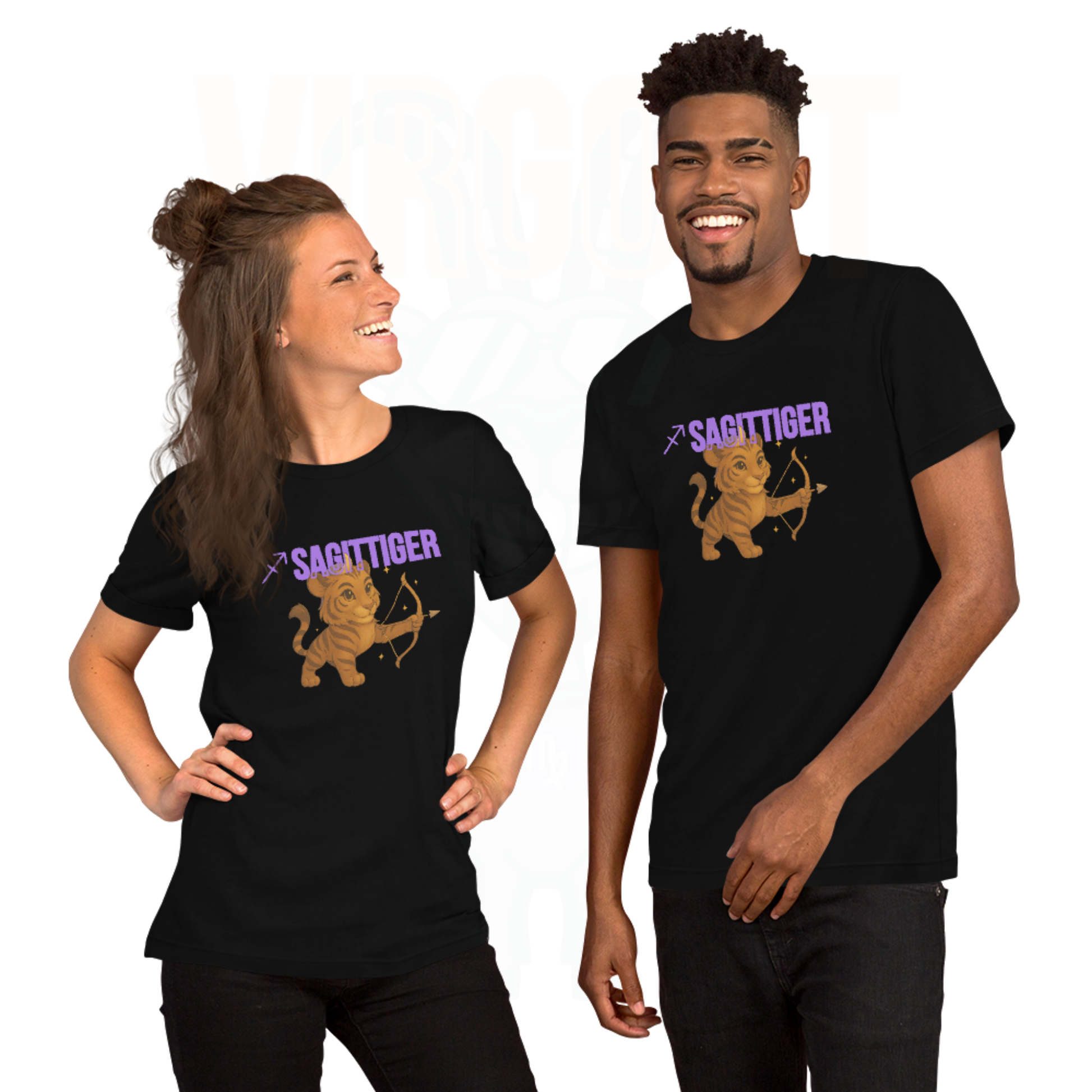 ♐ SAGITTIGER in Sagittarius Violet (#9B5DE5) + quote in black or white letters based on tee color